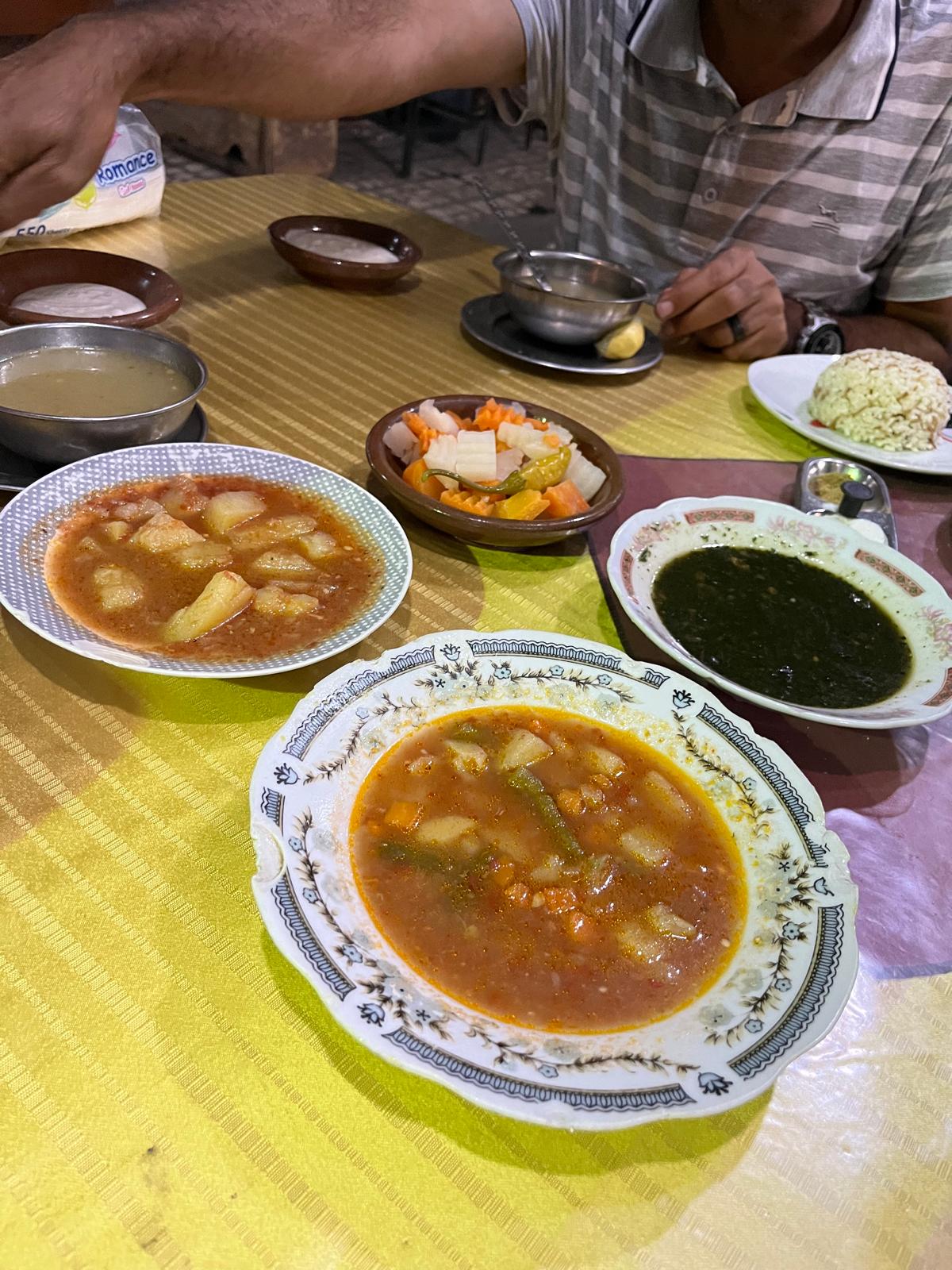 A traditional lunch we had many times was meat (chicken or beef) served with a plate of rice, tahini, bread, chopped vegetables and turley which is mixed vegetables with tomato sauce. I would call it a soup or stew but they were adamant it wasn’t (because they have other veggie soups that are thinner with more broth). It’s used to dip your bread in or pour over rice. The traditional pita bread is made with both corn and wheat giving it a heartier grainy texture.