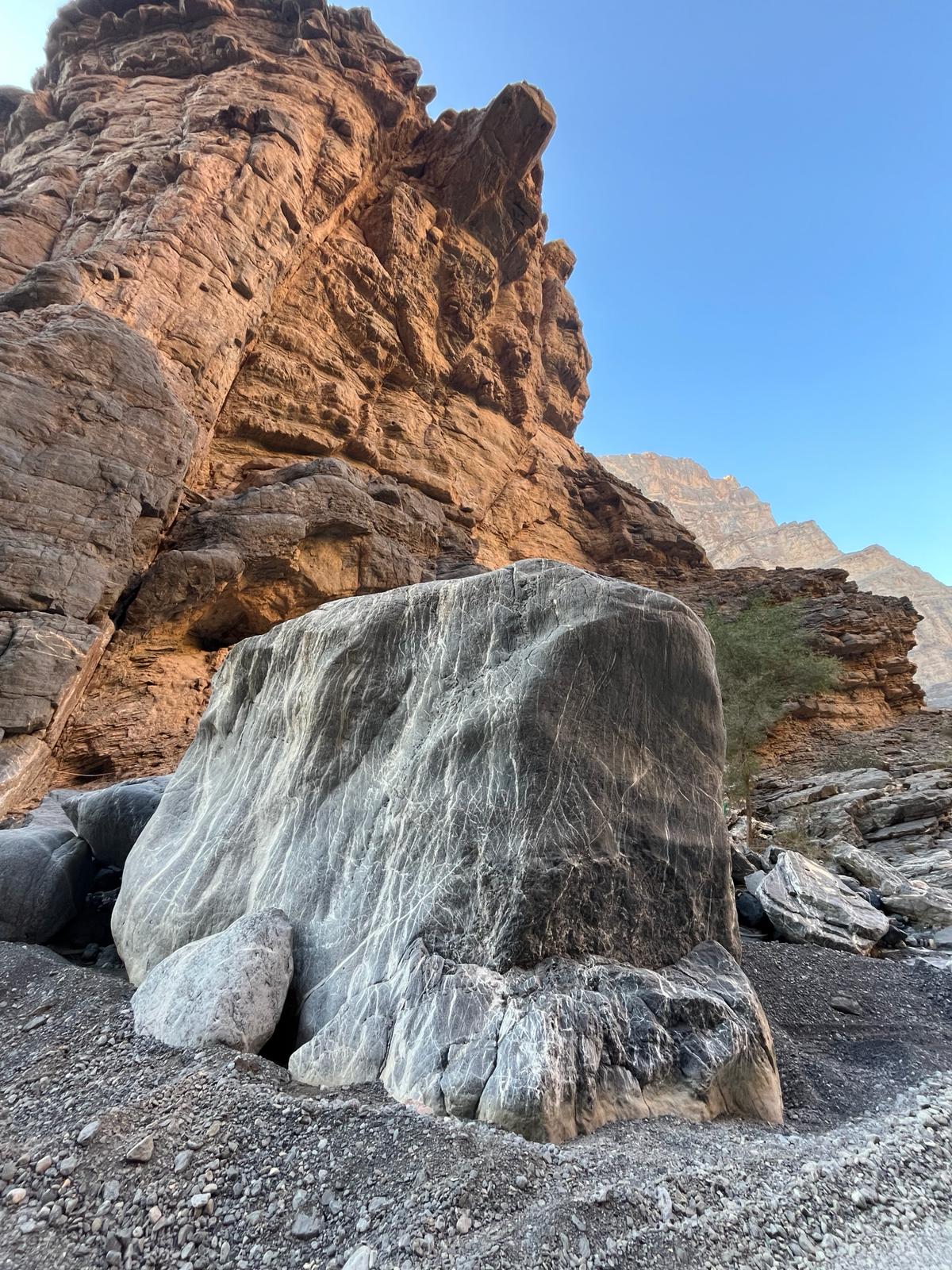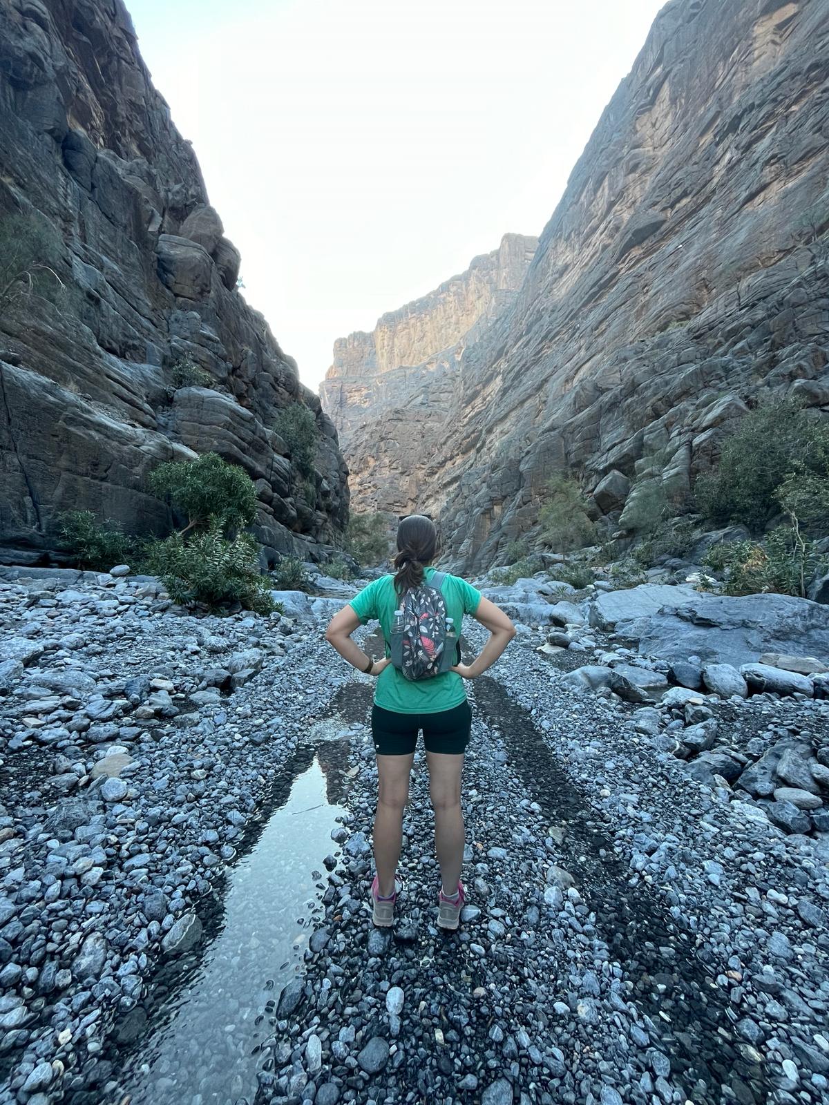 Another fabulous hike in the area starts with parking in the Valley Necrosis and walking back to Wadi Ghul. Now don’t be confused because on the map the pins for W6 – Balcony Walk Hike and Wadi Ghul seem side by side, but one starts at the top of the mountain and one starts on at the lowest point of the canyon. Hence the reasons I recommend you follow directions to Valley Necrosis. It’s possible to drive all the way back to Wadi Ghul but this is where we saw cars and small SUVs get stuck in the mud. The hike is relatively flat with a few small hills on a gravel road so I would recommend parking and walking. It was so serene and peaceful to be in the canyon we had just been looking at on our previous hike! We’ve been on a lot of hikes and honestly this was one of the most striking and stunning with the way the sun and shadows played off the canyon walls.