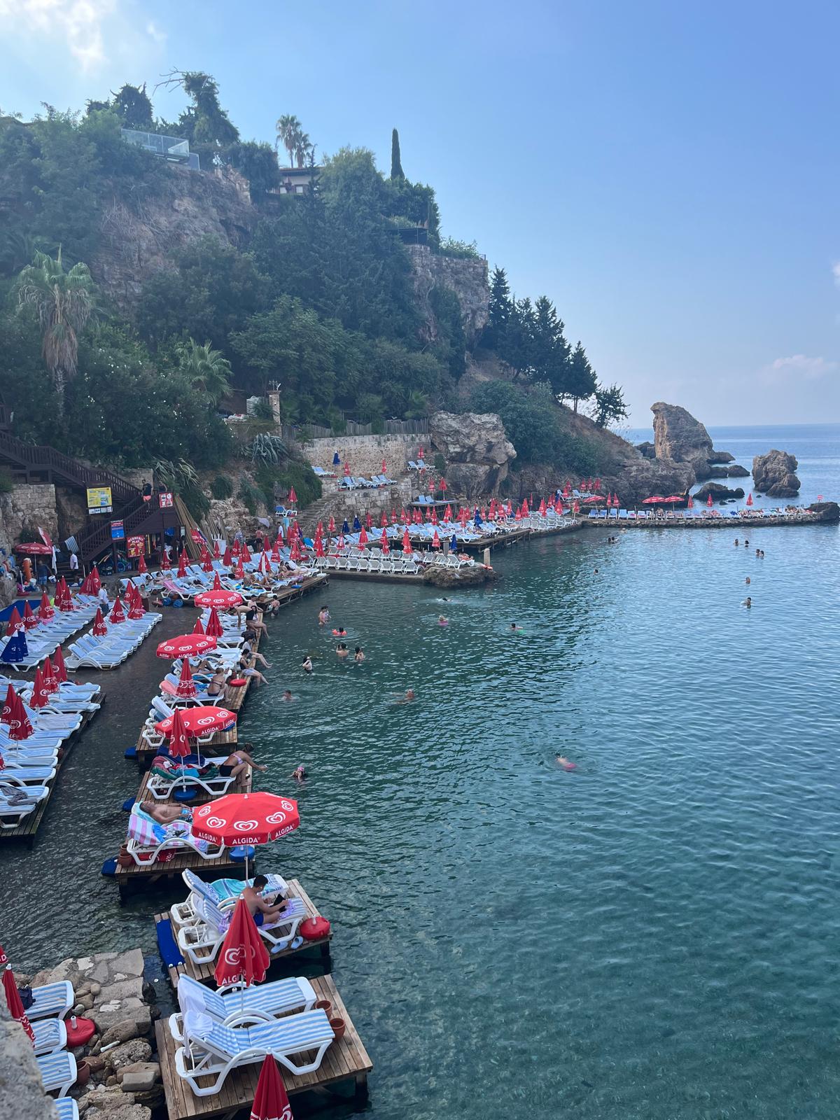 Kaleiçi is the historical city center of Antalya. The city was originally built in this small bay for protection. Today the old houses remain which are adorable but half of them seem to be crumbling. The area is most adorable from above. Walk through Tophane Parkı to get a good view of the historical neighborhood. When walking the streets of Kaleiçi, we found one of three things: shops selling goods for tourists (carpets, jewelry, pottery), luxury hotels and restaurants (but no parking to be found anywhere), or dirty night clubs and bars. It was a rather odd mix of things. We were not there at night so I cannot confirm how late the night clubs are open but judging by the amount of bottles and trash, it seems like people were having a good time. The Mermerli Plajı (beach) is right here. With no sand around and very limited space, you can pay a fee to rent a lounge chair and swim right off this pier. If you don’t want to pay, just a few steps away near the lighthouse, people were swimming off the big rocks. It doesn’t look comfortable to get to but many people were doing it. The water is crystal clear here so you can see what you are diving into! If you happen to be in the area on a Friday, swing by the Friday Market. It’s a large farmers market selling all sorts of fresh fruits, veggies, handmade cheese, dried fruits, nuts, herbs. Bring cash. Almost none of the vendors speak English so come prepared with knowing a few numbers or at least be quick with your phone for the calculator app. If you are looking for a larger beach, check out Konyaaltı Beach. Running most of the western coast of the city, this beach is large enough for everyone. It often doesn’t feel crowded even though there are lots of people. It is a pebble beach so come prepared with water shoes if you don’t like walking on rocks. Also you are able to rent chairs, umbrellas, and tables from one of the many vendors here.