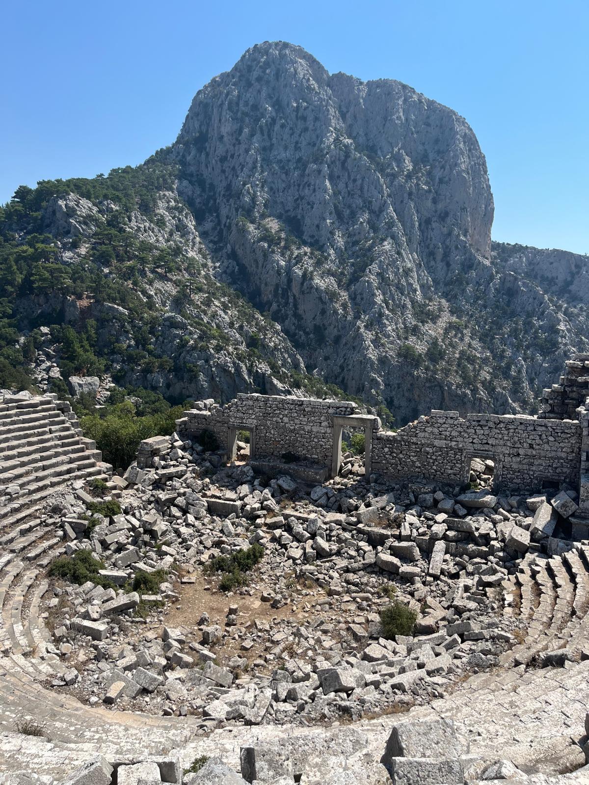 One of my absolute favorite things we did the whole trip was hike to the Termessos Ancient City Ruins. I was unfamiliar with this city or its history but fascinatingly enough Homer mentioned the Solymans (people who lived here) in his Iliad, the story of Troy, as brave warriors. Also this was one of very few cities that Alexander the Great was unable to conquer due to its advantageous position in the mountains. The Turkey Museum pass gets you in here. After entering the park with your pass (or buying a ticket), you drive about 7.5 km up the road and park at a small parking lot. There are bathrooms up here. Then you hike about 2km. It’s a proper hike through the mountains. As you are hiking, you will come upon different parts of this Termessos ancient city. The gymnasium, the temples, the houses, the quarry, the stone coffins, and the theater. This place is mind blowing as nothing has been excavated. Most ancient cities we’ve visited have all had to be excavated and “rebuilt” to show you what they think it was like. This city is all still standing from the original builders. It’s absolutely incredible. Also something that literally moved me to tears was the theater on the side of a mountain with the most breathtaking views of mountain peaks in the background.