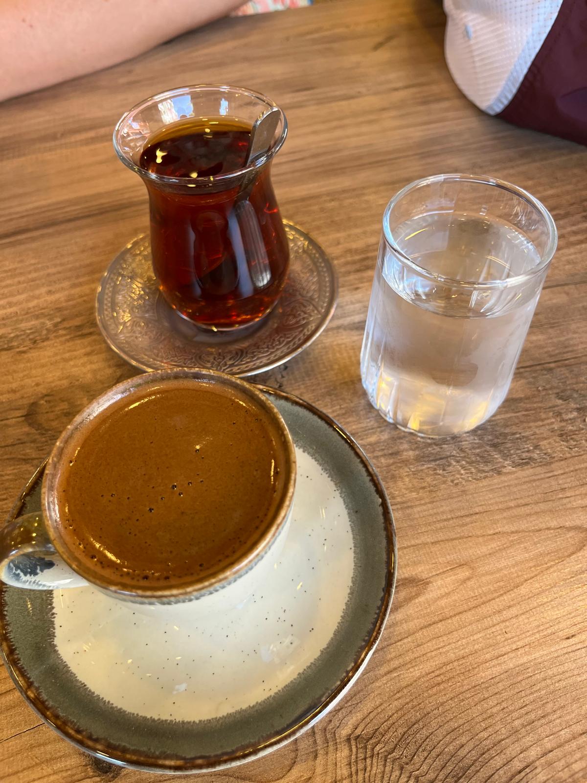 Speaking of, you can’t forget about the tea (çay) and coffee (kahve). The tea is served in the cutest little tulip shaped glass on a small plate with a spoon and sugar cube. We personally prefer it without sugar but some think the tea is a little bitter and prefer to add sugar. Turkish coffee is something you have to try. My husband doesn’t even like coffee and he likes this one. They serve it plain, with some sugar, or with full sugar. We prefer the middle one, some sugar. Without it was very bitter and hard to drink. With some sugar, it has a smoothness and charm to it. The grounds are so fine and sit at the bottom of the cup so don’t drink it all! Be prepared because they drink both tea and coffee day and night. After meals it’s a customary drink. In the afternoon, you’ll see shop owners having tea outside their store. At 8pm, you’ll see people having an evening coffee. It’s everywhere!